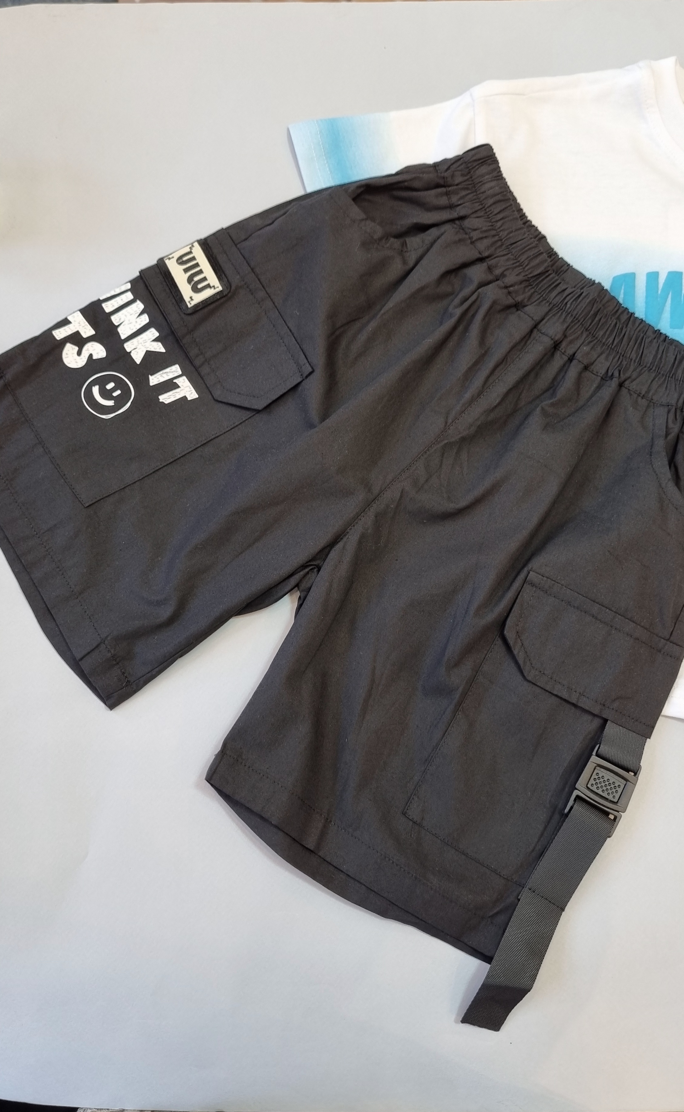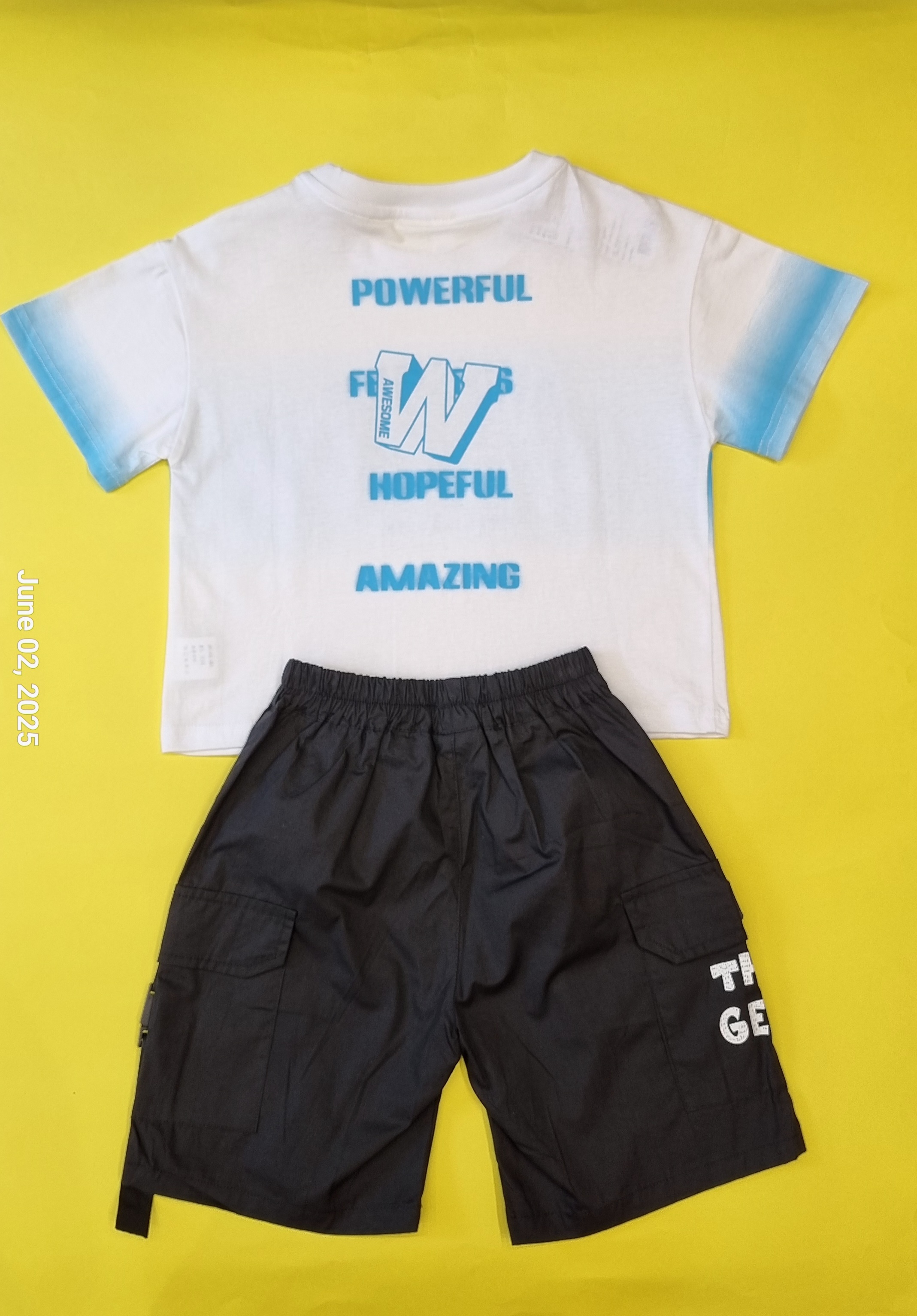 ست تیشرت تمام نخ و شلوارک کتان سفید و ابی پسرانه