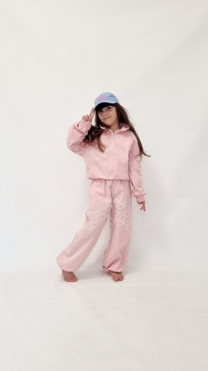 ست جکت زیپ دار و شلوار دخترانه صورتی گلدوزی شده